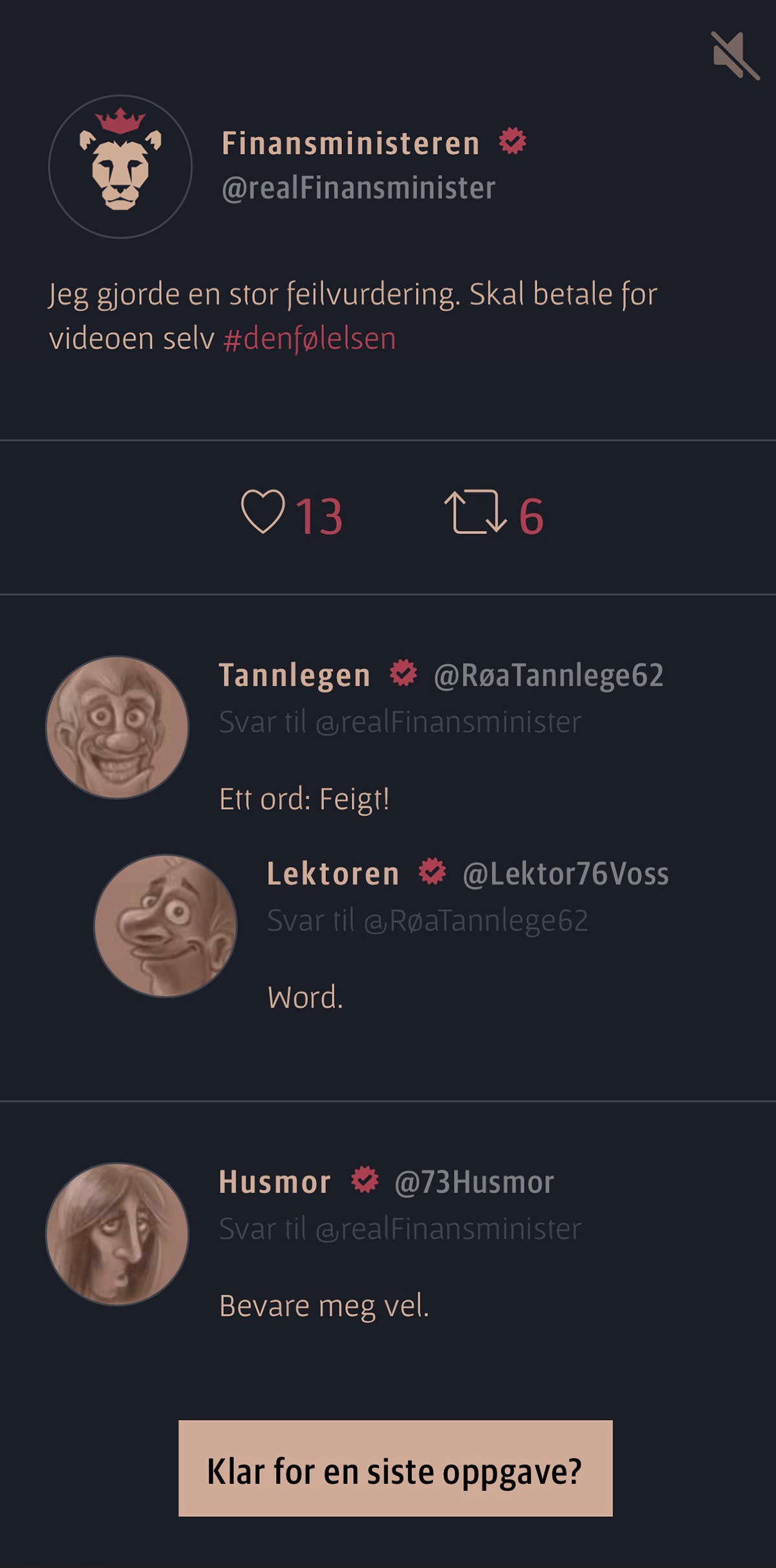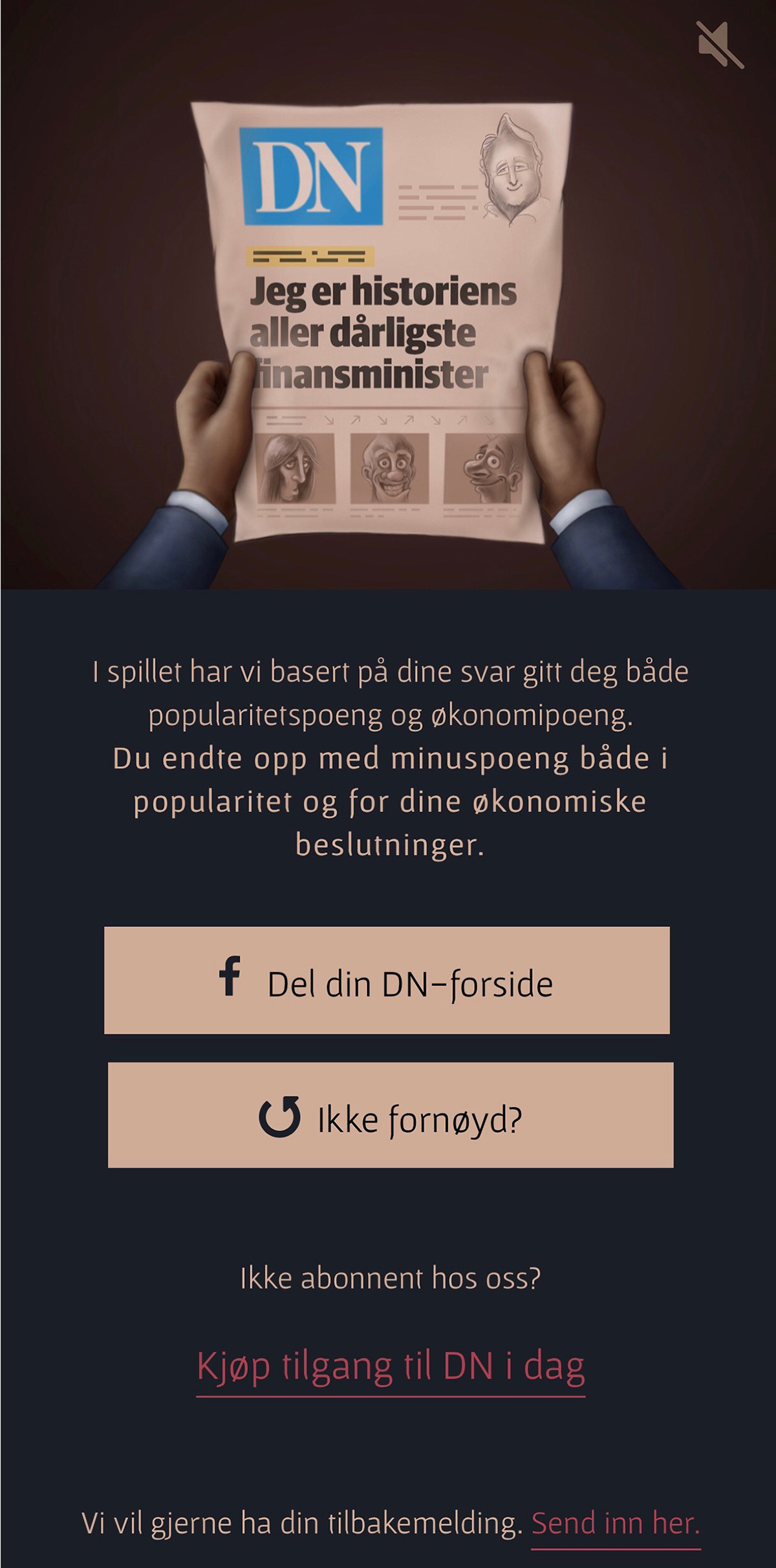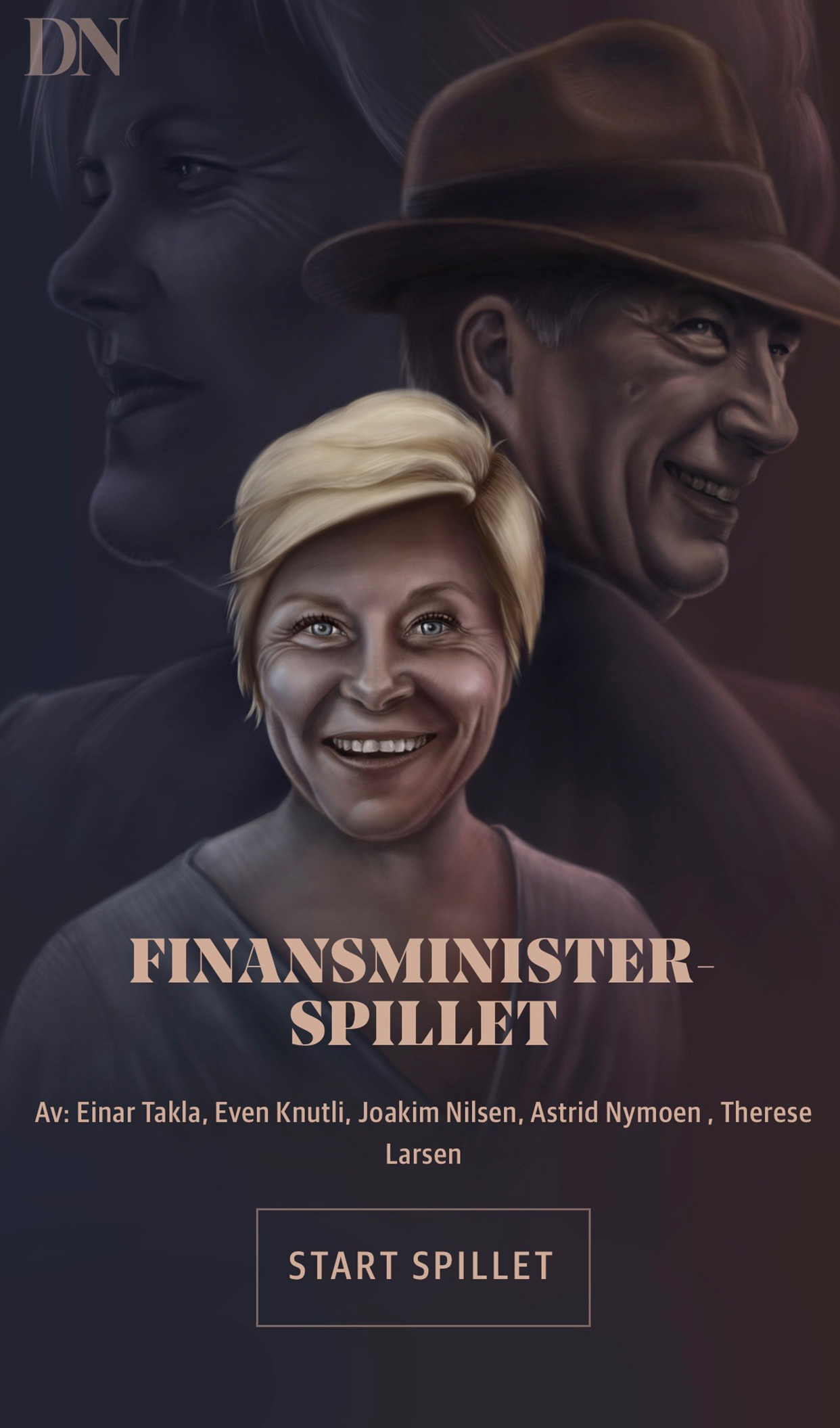 Beskrivelse: Et humoristisk spill laget for Dagens Næringsliv, hvor du er finansminister og må ta økonomiske valg på vegne av landet. Min rolle: Jeg har laget designet til rammeverket og grafikken, og satt typografien. Jobbet med historiefortellingen og fant lyd. Kommentar: Samspillet mellom oss som team fungerte veldig bra på dette prosjektet. Idé og manus: Einar Takla. Utvikling: Even Knutli. Illustrasjoner: Joakim Nilsen. Diverse: Therese Larsen.