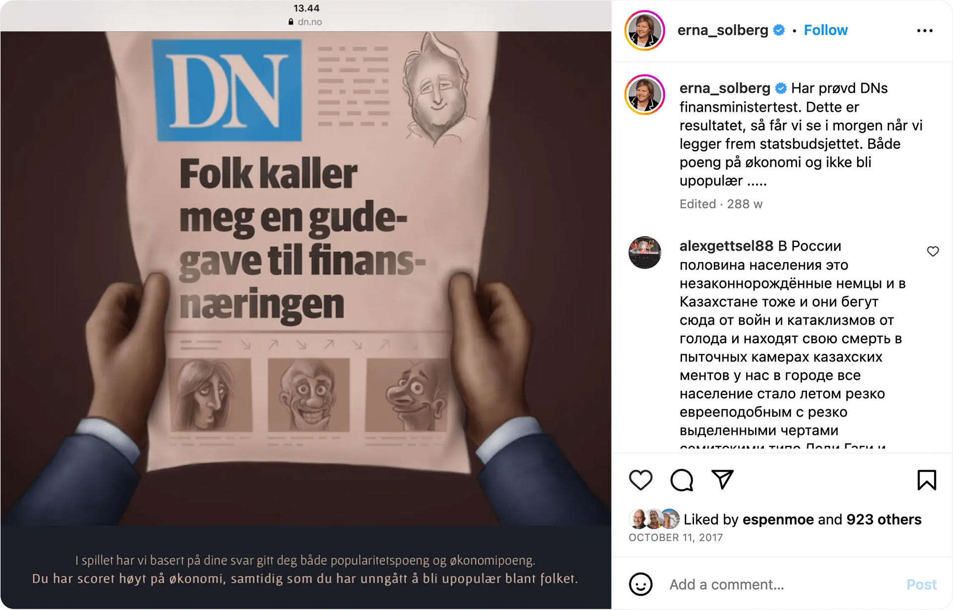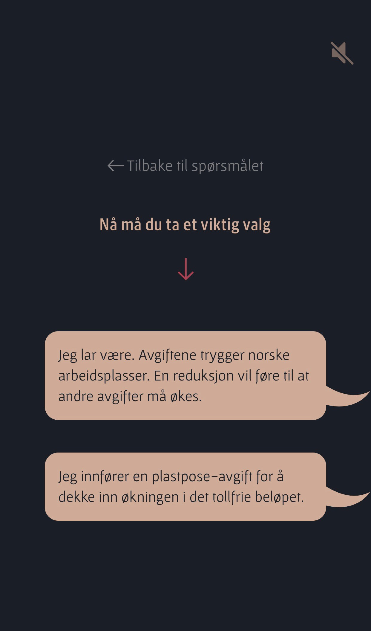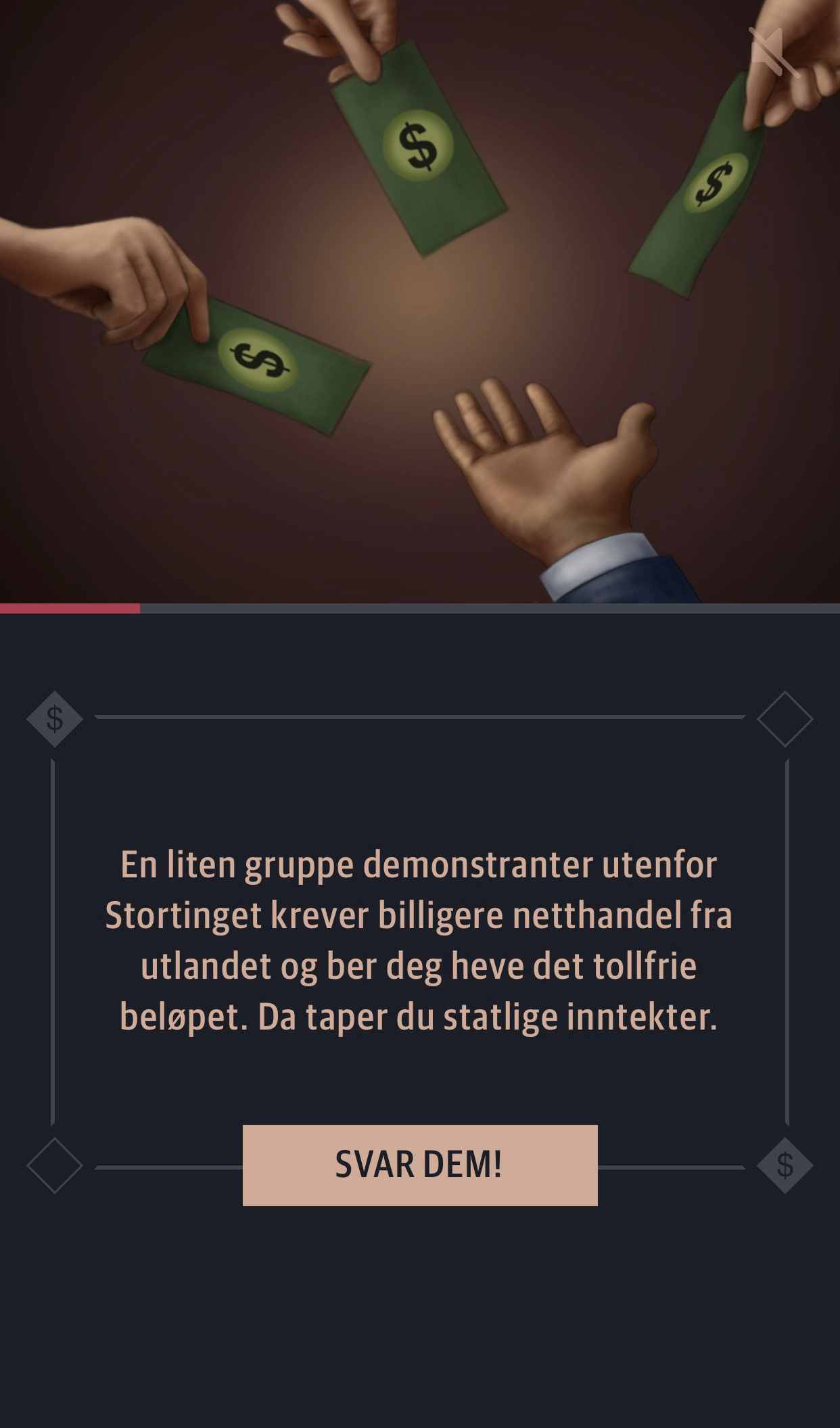 Beskrivelse: Et humoristisk spill laget for Dagens Næringsliv, hvor du er finansminister og må ta økonomiske valg på vegne av landet. Min rolle: Jeg har laget designet til rammeverket og grafikken, og satt typografien. Jobbet med historiefortellingen og fant lyd. Kommentar: Samspillet mellom oss som team fungerte veldig bra på dette prosjektet. Idé og manus: Einar Takla. Utvikling: Even Knutli. Illustrasjoner: Joakim Nilsen. Diverse: Therese Larsen.