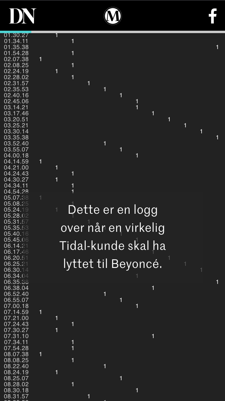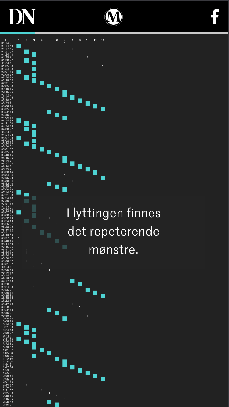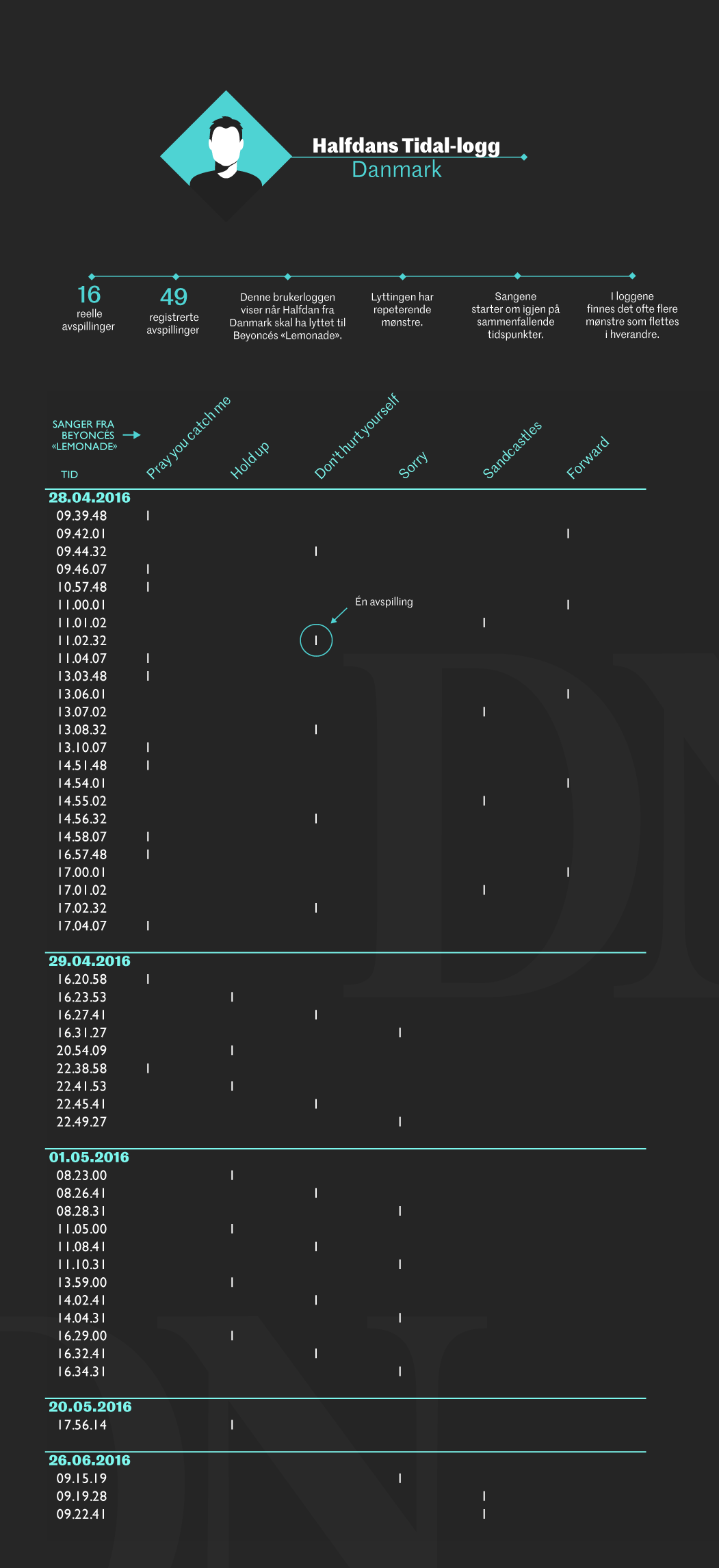Her er et eksempel på en brukerlogg hos Tidal. Det gjennomgående mønsteret er tydelig.